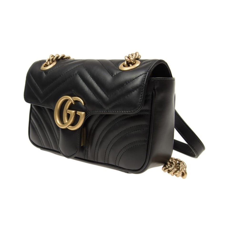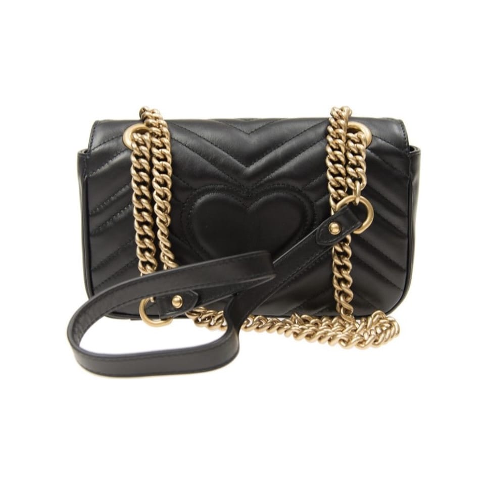 Сумка GG Marmont маленького размера на ремне-цепочке с крупной застежкой-клапаном и фурнитурой в виде двойной буквы G. Благодаря скользящей цепочке ее можно носить несколькими способами — на плече или за ручки. Модель выполнена из стеганой кожи с геометричным узором и сердечком с обратной стороны.